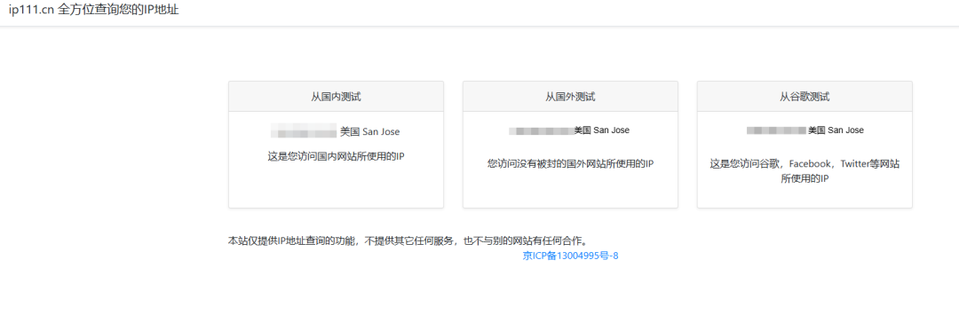 成功连接之后,可以去浏览器去测试一下看看是否可以正常上歪网,访问以下网址看看IP地址是否是服务器IP,连接之后默认是全局模式,不能切换规则。