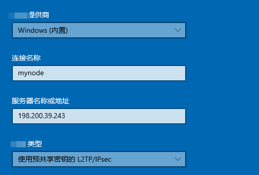提供商就选择默认的Windows内置,连接名称自定义,服务器名称就填写服务器IP,类型选择预共享密钥L2TP/IPsec。