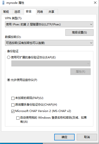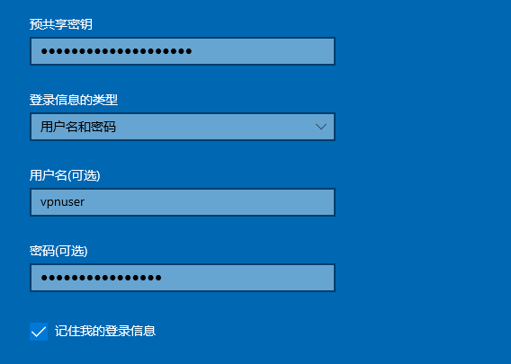 预共享密钥就填写VPS输出的PSK,登录信息的类型就选择“用户名和密码”,用户名和密码就填写输出的信息,完成之后点击保存。