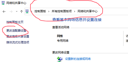 重启完成之后我们需要打开 控制面板 → 网络和共享中心 → 更改适配器设置。