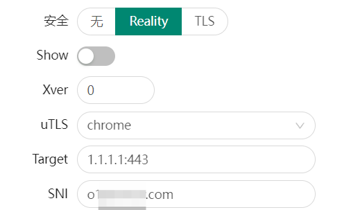 接着往下,安全这里选择“Reality”,将Target改为4个1,如图所示,然后将SNI这里把刚才复制的电子邮件粘贴进去,后边再加上.com,当然这里自定义即可,只是伪装成正常域名而已。