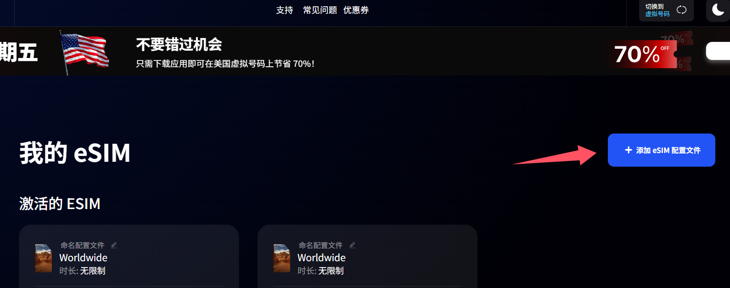 注册好账号并登录好后,点击“添加eSIM配置文件”,因为我已经购买了两个,所以按钮的位置不太一样。