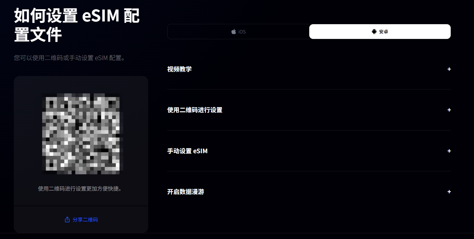 点击”How to use如何使用”,进入详细页面,页面往下滑,你会看到一个二维码,使用手机去扫描二维码,如果你的手机支持eSIM功能,那就直接扫描就行,如果不支持,那就只能购买一个eSIM卡来进行使用,这个卡的作用就是可以让不支持eSIM的手机,插上这个卡之后,通过特定的APP去扫描eSIM号码的二维码,然后写入到这个eSIM卡中,一个eSIM卡可以写入多个eSIM号码。若有想法,可联系我咨询。