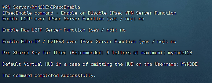 它会出现三个选项和两个输入内容,前三个选项都选择 no ,后两个如下图,Key for IPsec:这是让你输入预共享密钥,这个连接的时候要用,要记住,自定义即可,而最后一个输入内容就是你之前创建的Hub的名称,我之前创建的名称是MYNODE,然后回车即可。